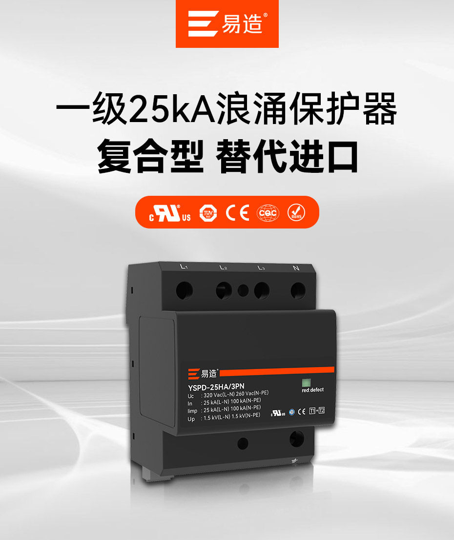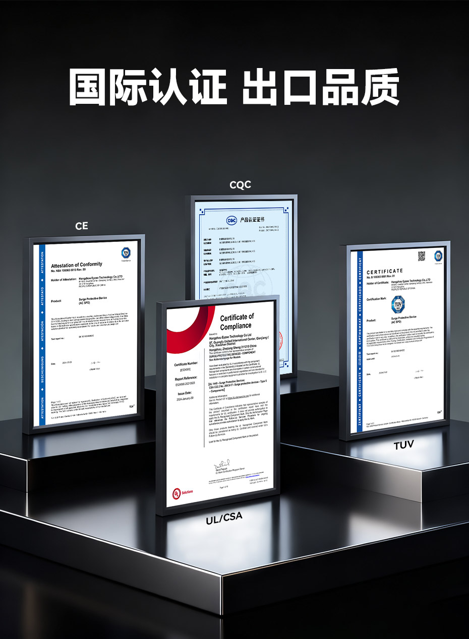 易造復合型一級浪涌保護器擁有UL、TUV、CE、CQC等國內國際質量認證,符合全球市場的最高安全和RoHS歐盟環保標準,可替代進口品牌SPD,支持外貿出口。