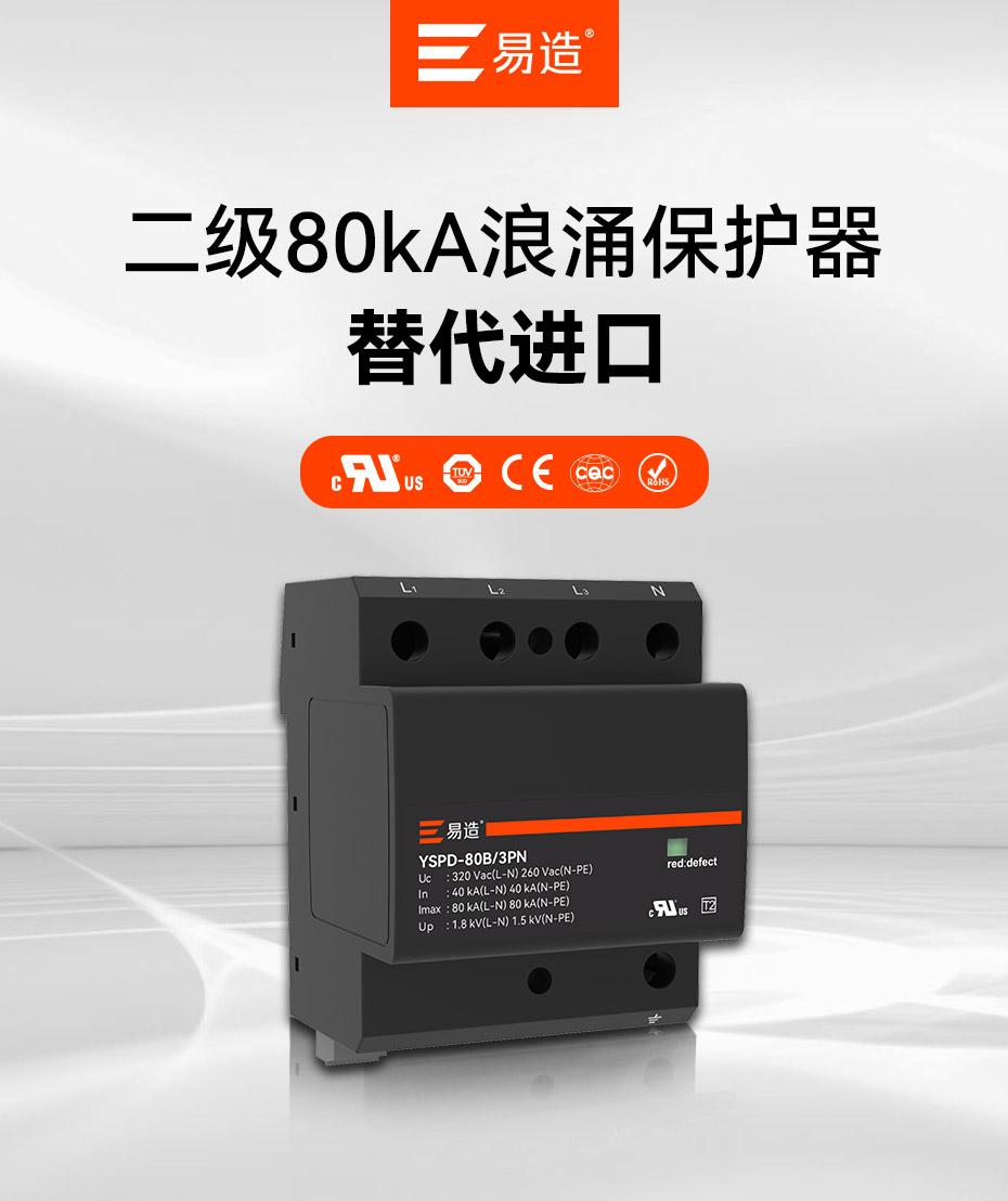 易造T2級大通流浪涌保護器,擁有UL、TUV.CE、COC等國內國際質量認證,符合全球市場的最高安全和RoHS歐盟環保標準,可替代進口品牌SPD,支持出口。
