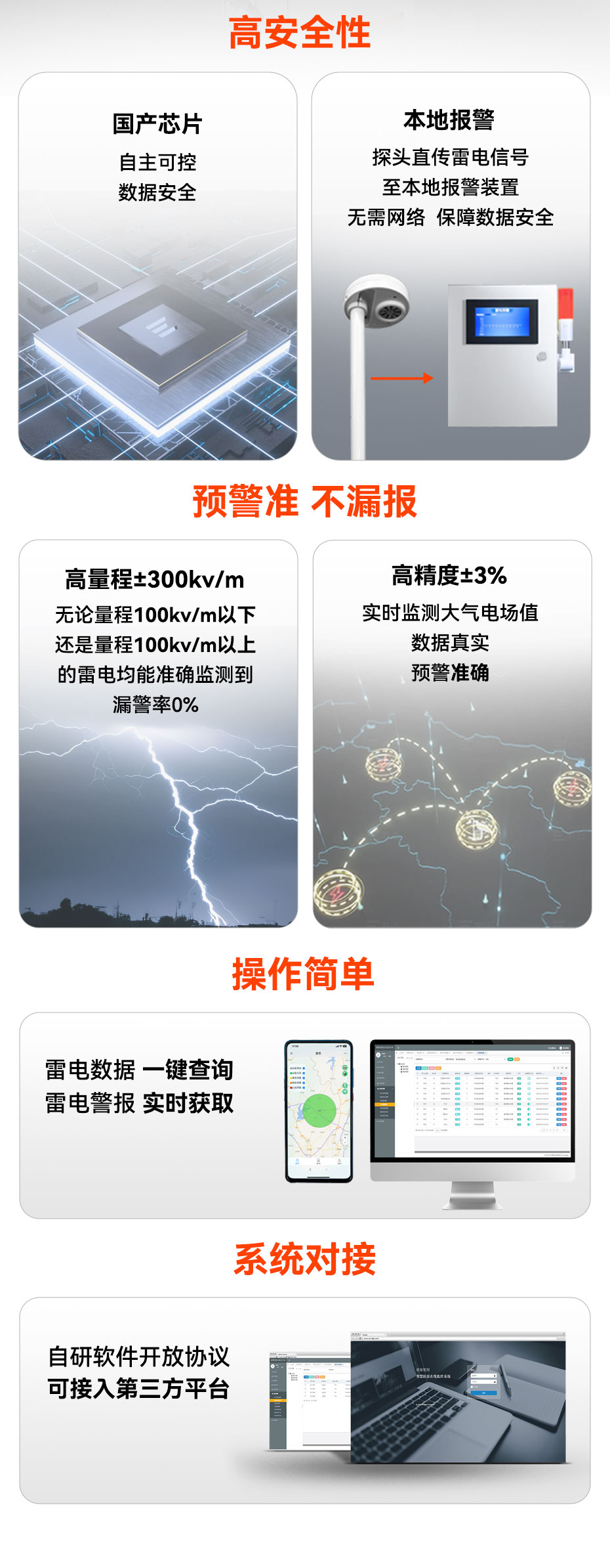 易造場(chǎng)磨式大氣電場(chǎng)儀采用FSM測(cè)量技術(shù),能探測(cè)到雷電從初始、成長(zhǎng)、成熟到消散4個(gè)階段的大氣電場(chǎng)變化。其算法分析軟件集成在探頭內(nèi)部,無(wú)需網(wǎng)絡(luò)即可輸出信號(hào)至本地報(bào)警,確保數(shù)據(jù)安全,還可融合氣象多普勒雷達(dá)、閃電定位等數(shù)據(jù)。IP65預(yù)警探頭具有WF2防腐等級(jí),可在各種環(huán)境條件下長(zhǎng)期穩(wěn)定運(yùn)行,使用壽命長(zhǎng)達(dá)10年以上。