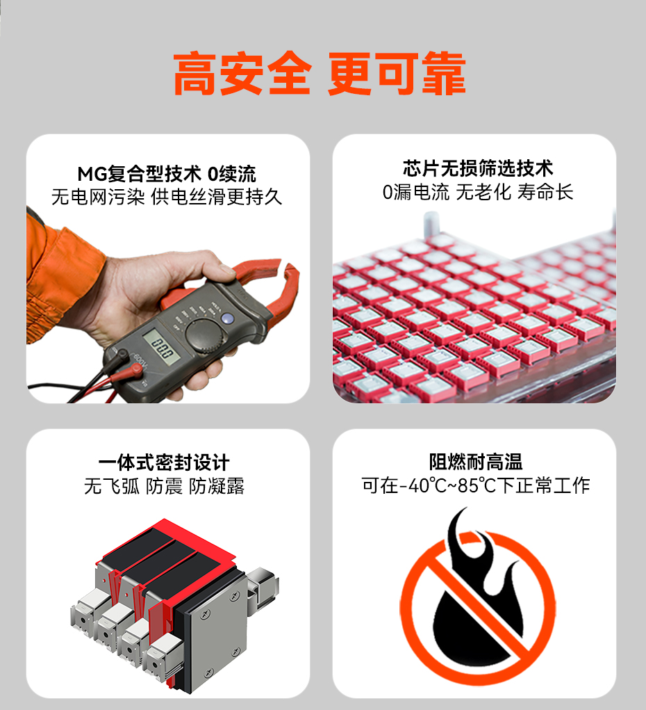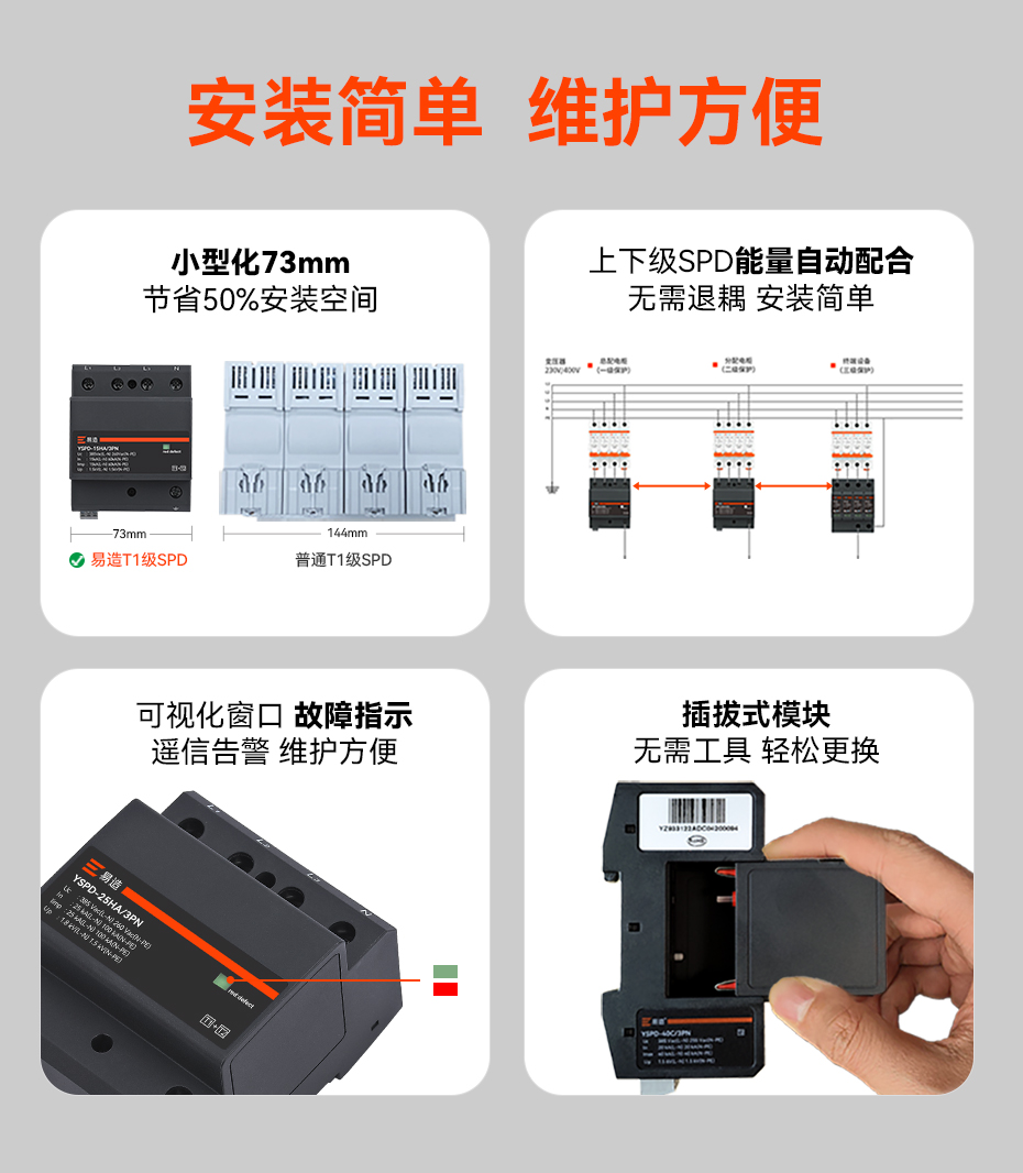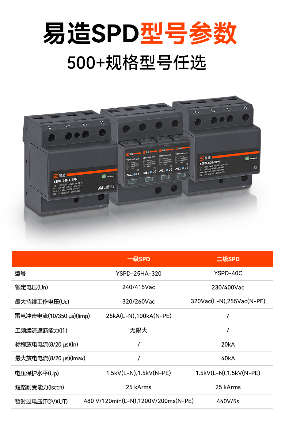 易造YSPD系列一級、二級、三級電涌保護器將安全和創新出色地融合在一起,采用突破性MG復合型技術,解決了傳統SPD的短板缺陷,無續流無漏電流,延長了SPD使用壽命并提高了供電效率;易造SPD小型化設計,每相寬度僅一個模數(18mm),使配電箱的空間更充裕,并具有本地及遠程告警功能,維護方便;靈活的鏈式放電技術簡化了SPD的安裝方式,上下級SPD能量自動配合,無需退耦器,顯著提升了電涌保護效率和TOV耐受能力,確保供電系統的穩定性。
