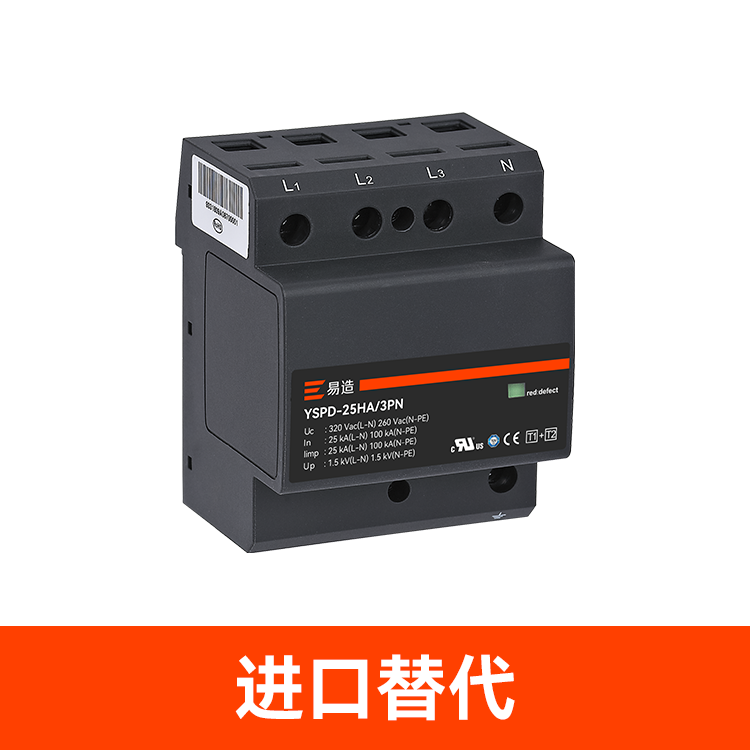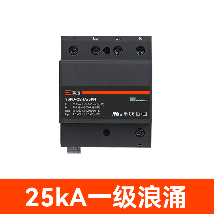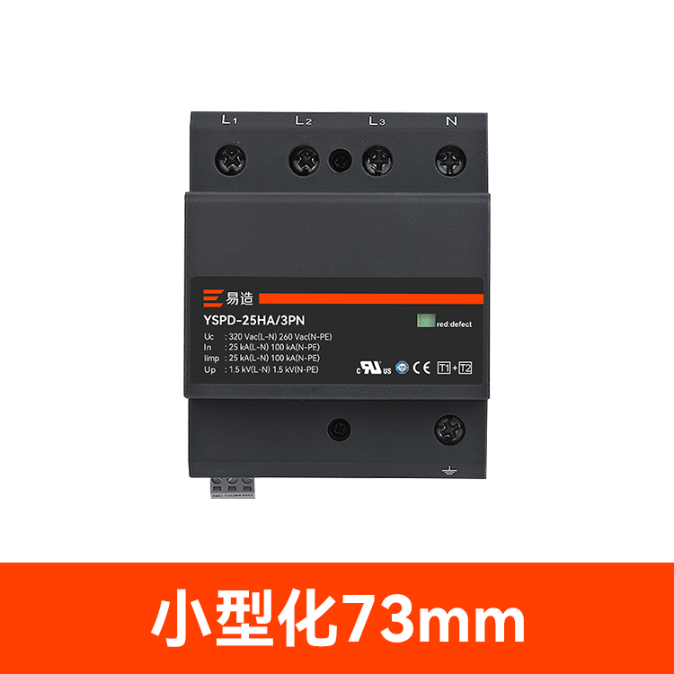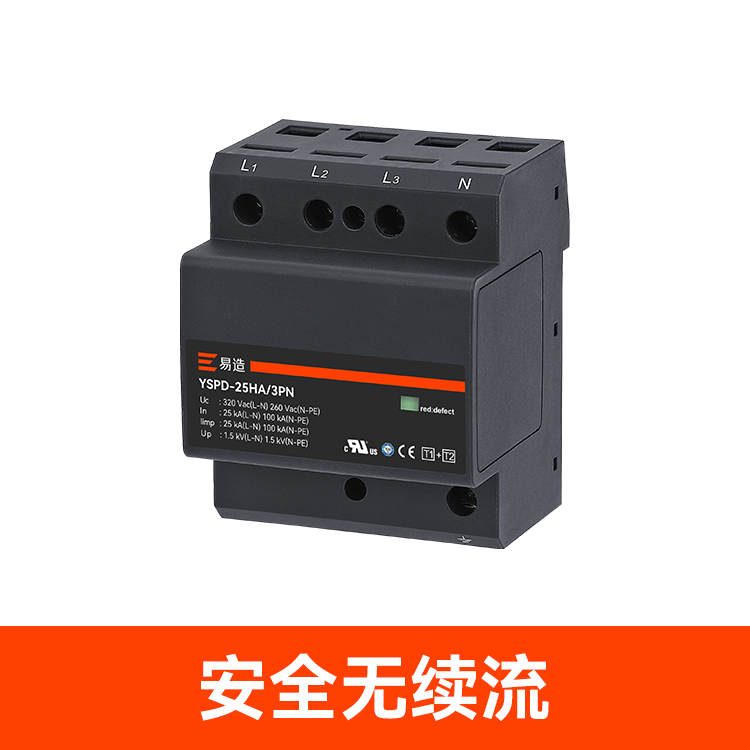 易造1+2級25kA復合型浪涌保護器安全無續流、體積小每相僅一個模數寬(18mm)、高通流低Up,帶故障指示、遠程告警功能、維護方便,最大持續工作電壓高達760Vac,可直接保護終端設備。