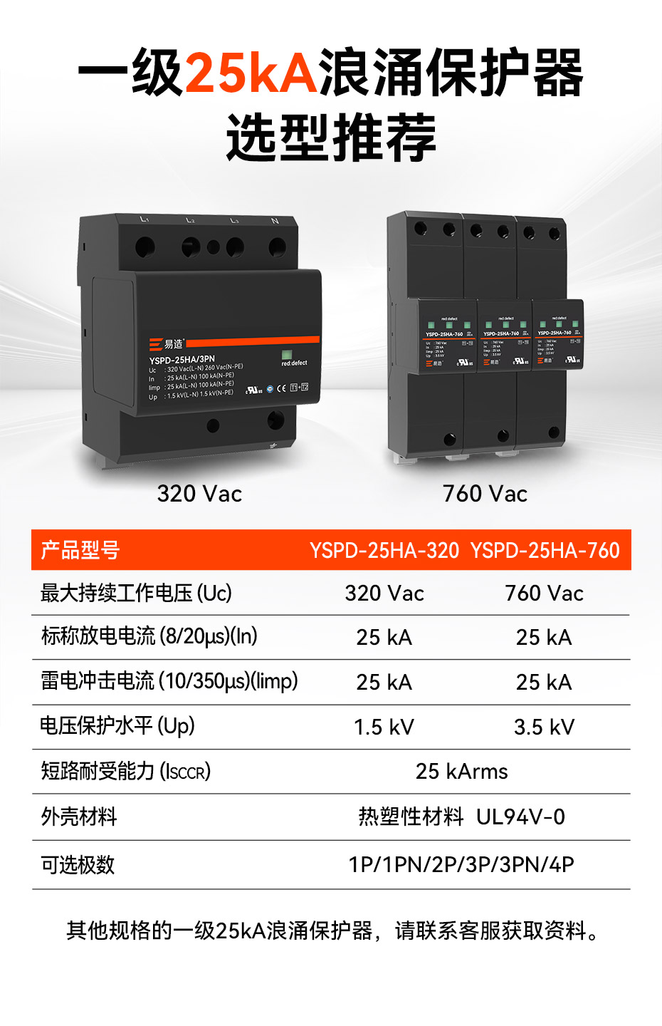 易造1+2級25kA復合型浪涌保護器安全無續流、小體積、高通流、低Up,帶故障指示、遠程告警功能,維護方便,最大持續工作電壓Uc高達760Vac,可直接保護終端設備。