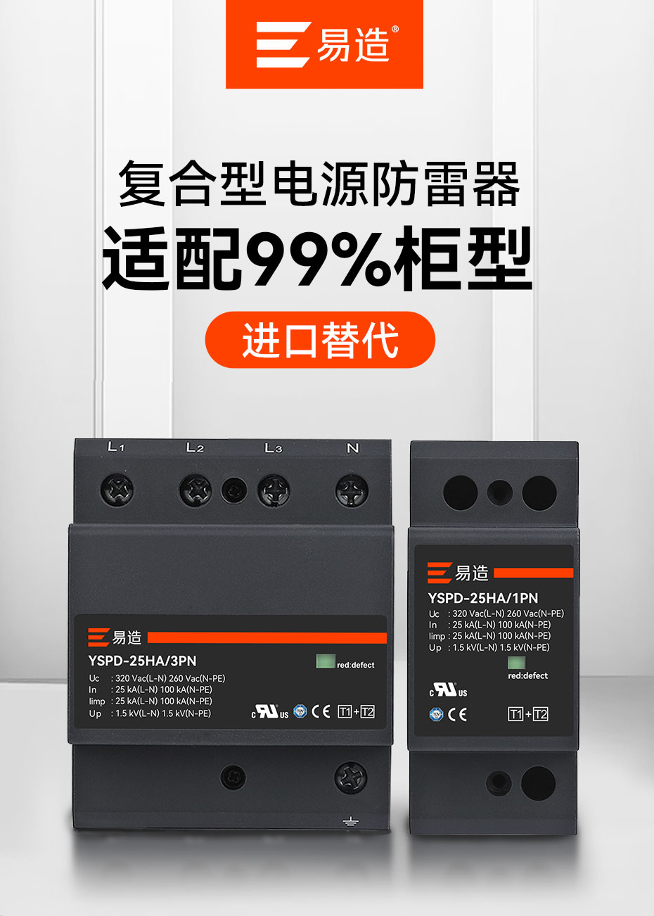 易造YSPD系列一級、二級、三級電源防雷器將安全和創新出色地融合在一起,采用突破性MG復合型技術,解決了傳統SPD的短板缺陷,無續流無漏電流,延長了SPD使用壽命并提高了供電效率;易造SPD小型化設計,每相寬度僅一個模數(18mm),使配電箱的空間更充裕,并具有本地及遠程告警功能,維護方便;靈活的鏈式放電技術簡化了SPD的安裝方式,上下級SPD能量自動配合,無需退耦器,顯著提升了電涌保護效率和TOV耐受能力,確保供電系統的穩定性。